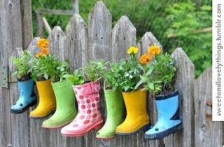 vou confessar para vocês que não sou das mais fãs, mas acho mais legal quando as galochas são utilizadas assim no chão ou no jardim do que, por exemplo, em cima de uma mesa ou de um móvel. Na minha opinião não combina muito um sapato ficar em cima da mesa na decoração, mesmo nunca tendo sido utilizado.