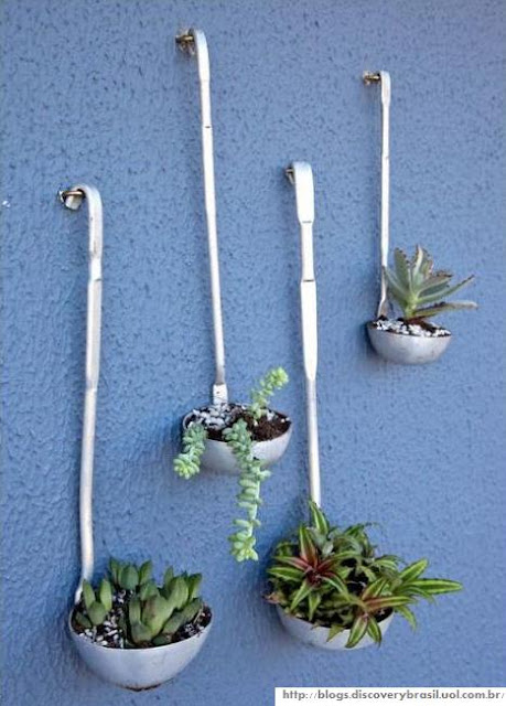 Hoje vim mostrar para vocês um pequeno jardim que fica suspenso e não ocupa muito lugar. Bom para apartamentos. É feito com conchas de cozinha, daquelas de sopa ou feijão e nelas foram colocadas as plantinhas. Não se pode esquecer de furá-las embaixo para escorrer a água quando forem aguadas.